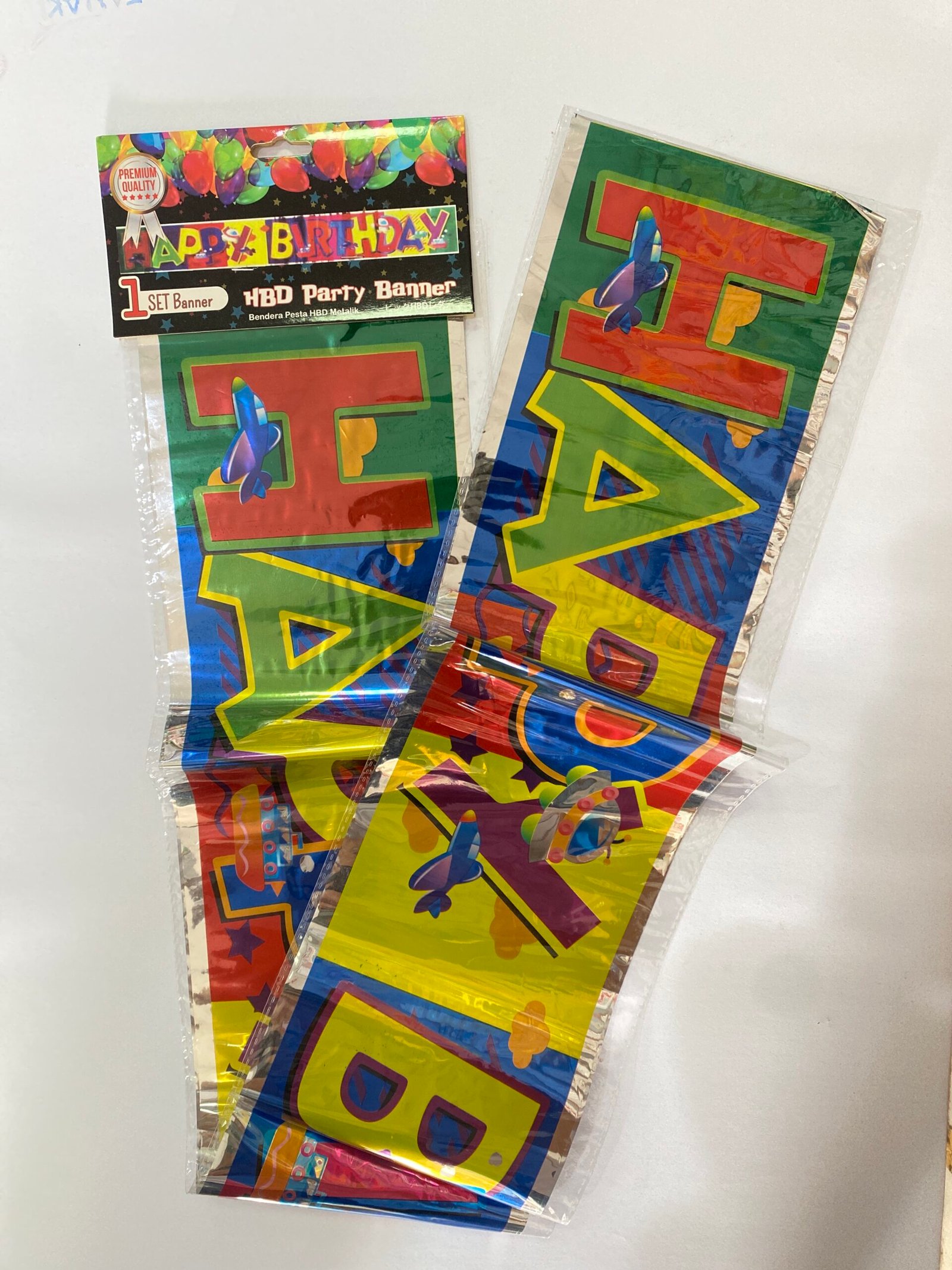 Banner Happy Birthday dengan desain menarik. Mudah dipasang dan cocok untuk dekorasi ulang tahun anak maupun dewasa.