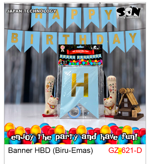 Banner HUT biru emas dengan desain elegan dan eksklusif.