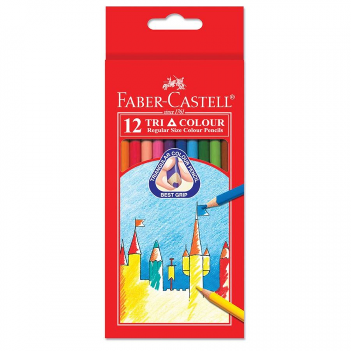 Pensil warna Faber-Castell bentuk segitiga (Tri-Grip) isi 12 warna. Nyaman digenggam dan tidak mudah tergelincir.