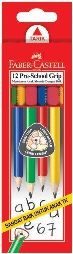Pensil Faber-Castell Pre-School dengan grip ergonomis, ukuran 12 batang; ideal untuk anak usia dini belajar menulis.