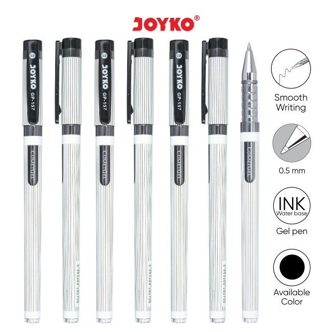 Joyko Gelpen GP-157 Comet menghasilkan tinta hitam pekat dengan aliran halus. Cocok untuk menulis sehari-hari di sekolah dan kantor.